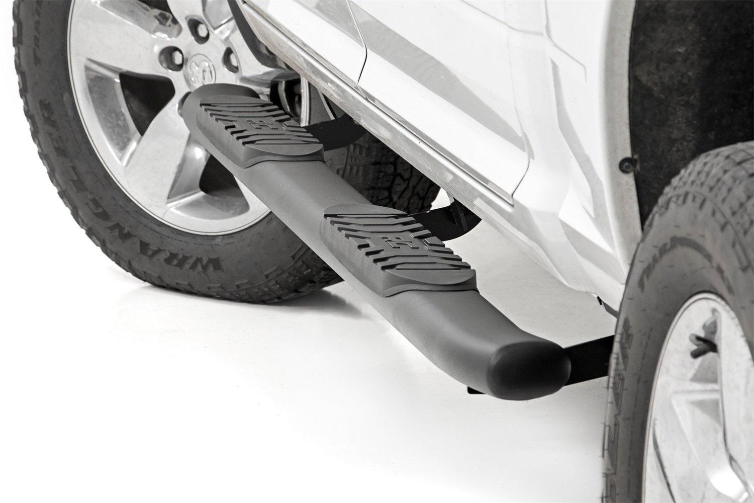 Gain easier access to your cab with the classic, OEM look of Rough Countrys Oval Nerf Step Bars. These durable, steel side steps feature a comfortable, 4.5- in. wide stepping area built into a large, tubular nerf rail that mimics the look of the popular OEM oval step design. Each nerf board features a long-lasting black powder coat and durable steel construction that can support up to 500lbs! Each step offers a 30-degree angled end design looks great on any vehicle. A secure, 4.5- in. wide stepping area features a non-slip pad to ensure a confident footing each and every time.